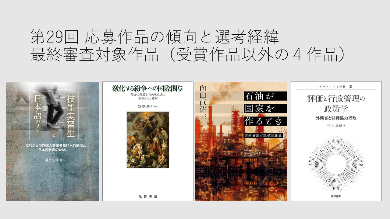 FASID国際開発研究センターにおいて予備審査を行い、受賞作に加えて下記4作を最終審査対象として選出した。審査過程における委員による意見はおおよそ以下のとおりである。(書名五十音順)